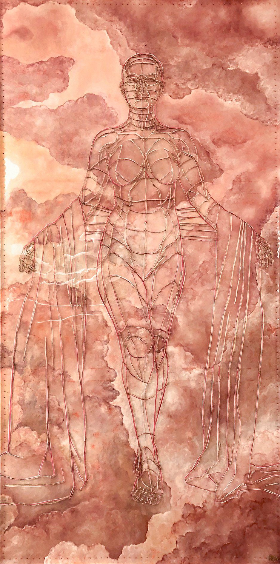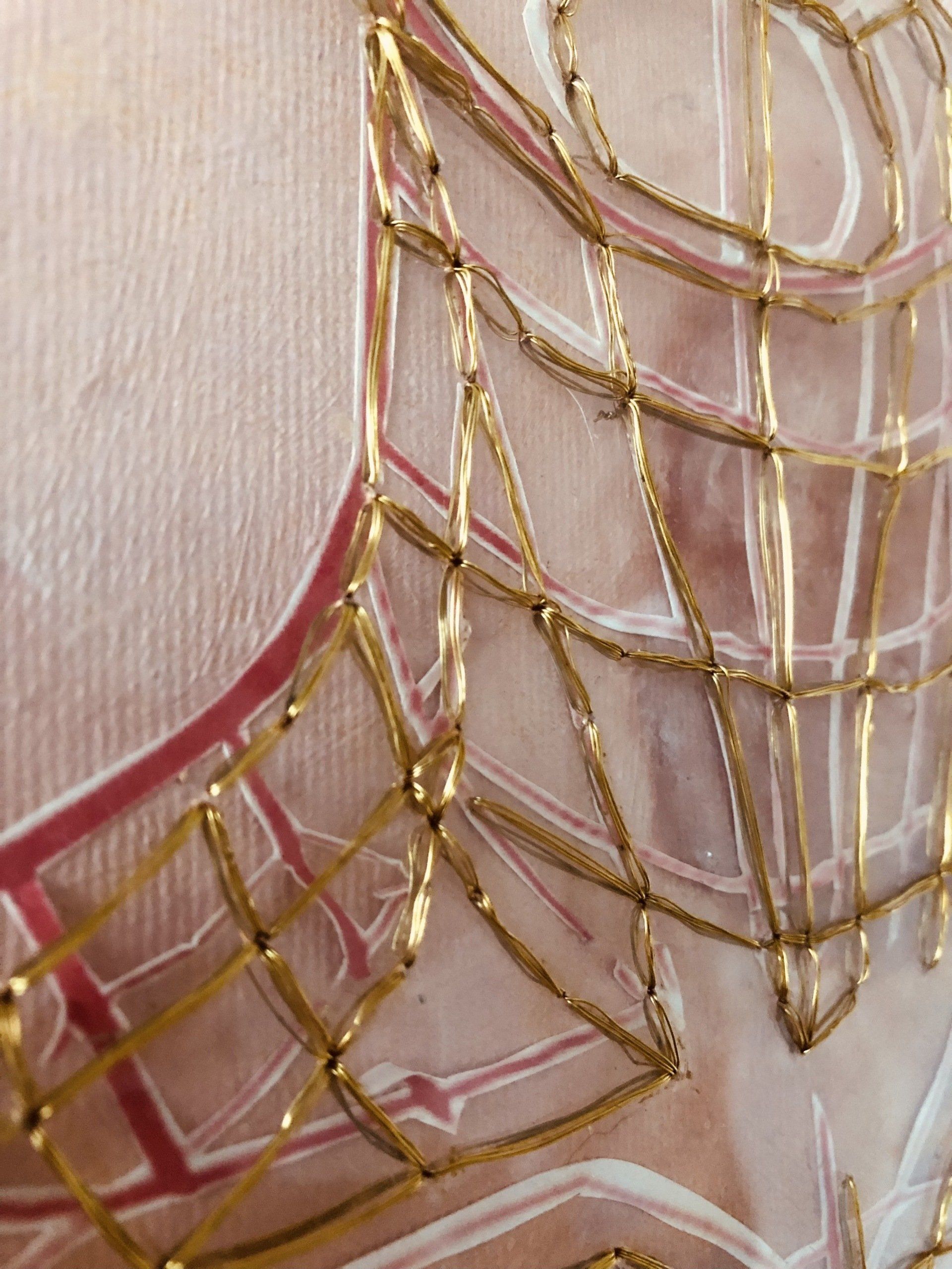 My nights are frequently consumed with nightmares, and one of my methods of coping is to try to find the beauty within them and transfer it to canvas. A dream of the Apocalypse, death, and an abyss of fire was transformed into a tale of resilience and symbolises beauty's triumphant emergence from the depths of chaos. The oil-painted background is adorned with a delicate white and red paper cutout embodying feminine strength. A third layer of thick transparent plastic foil adds depth, while intricate gold wire stitches along the woman's contour. A dozen tiny golden nails secure the plastic foil onto the canvas.
