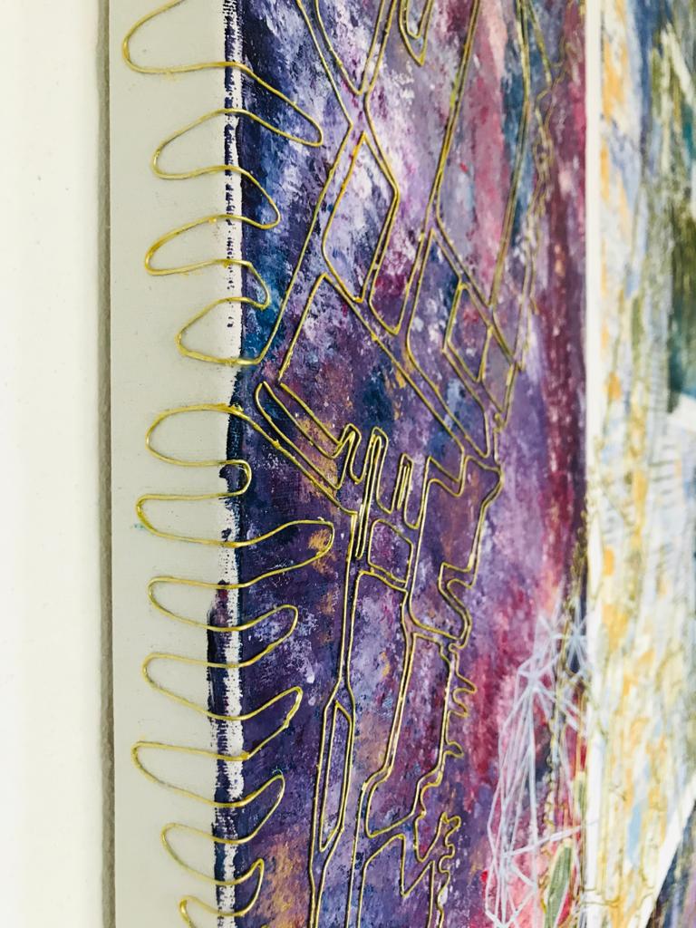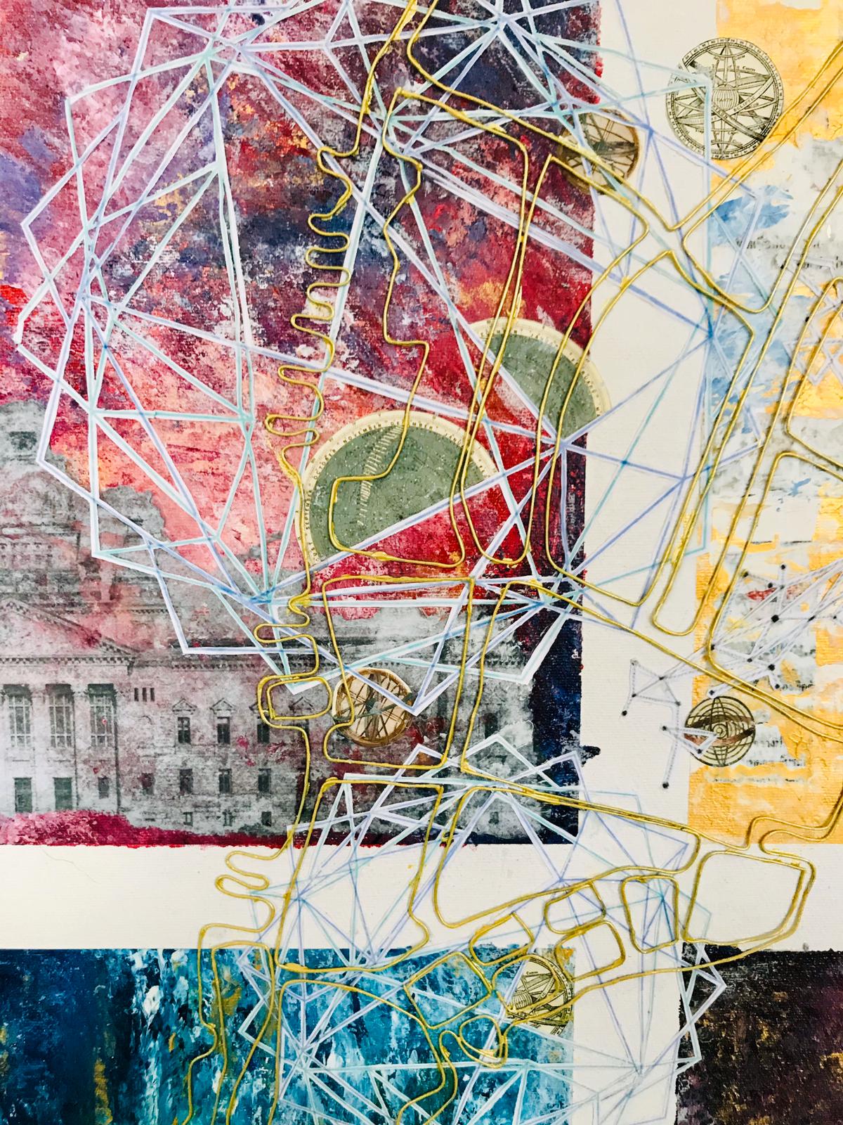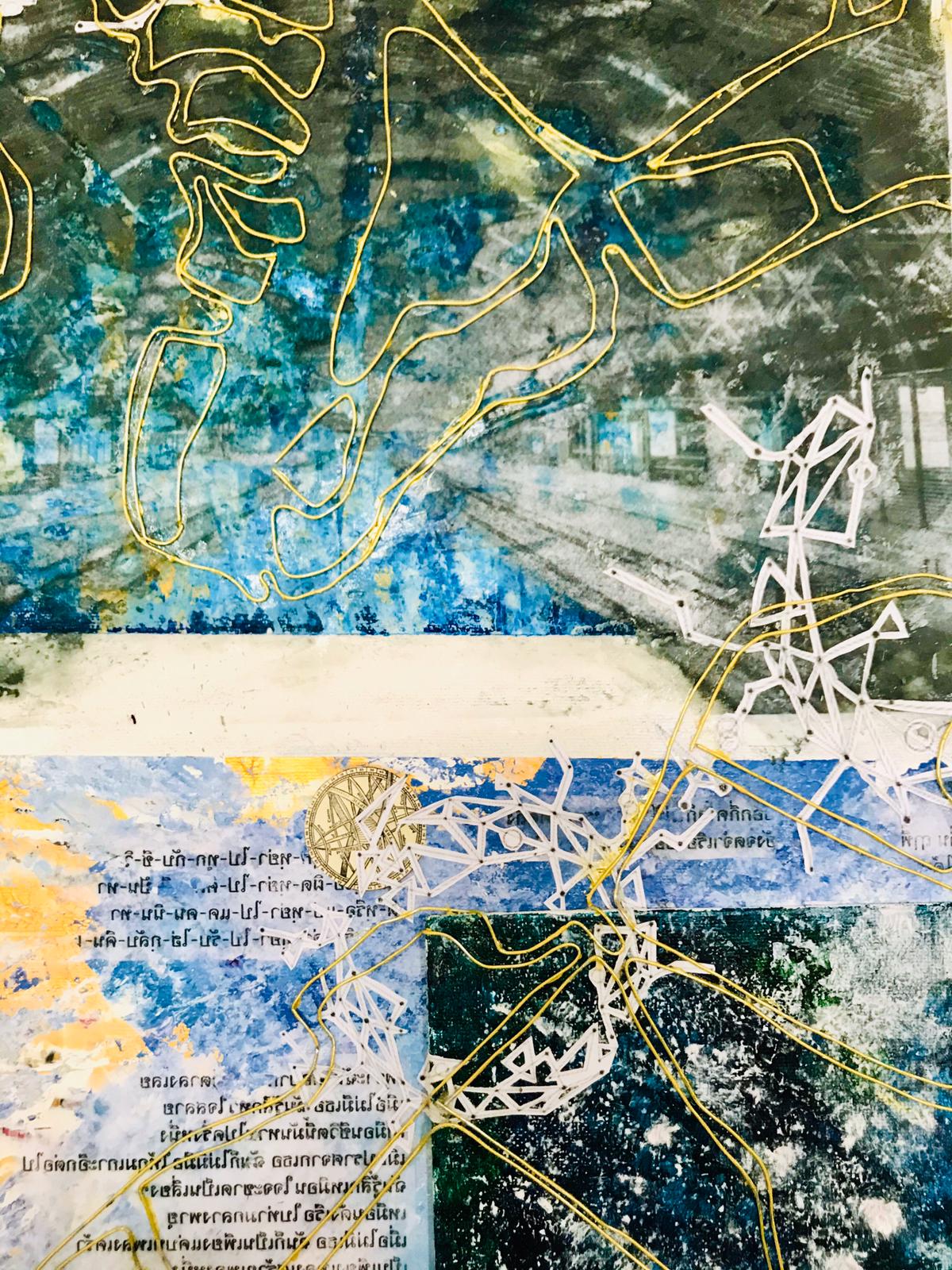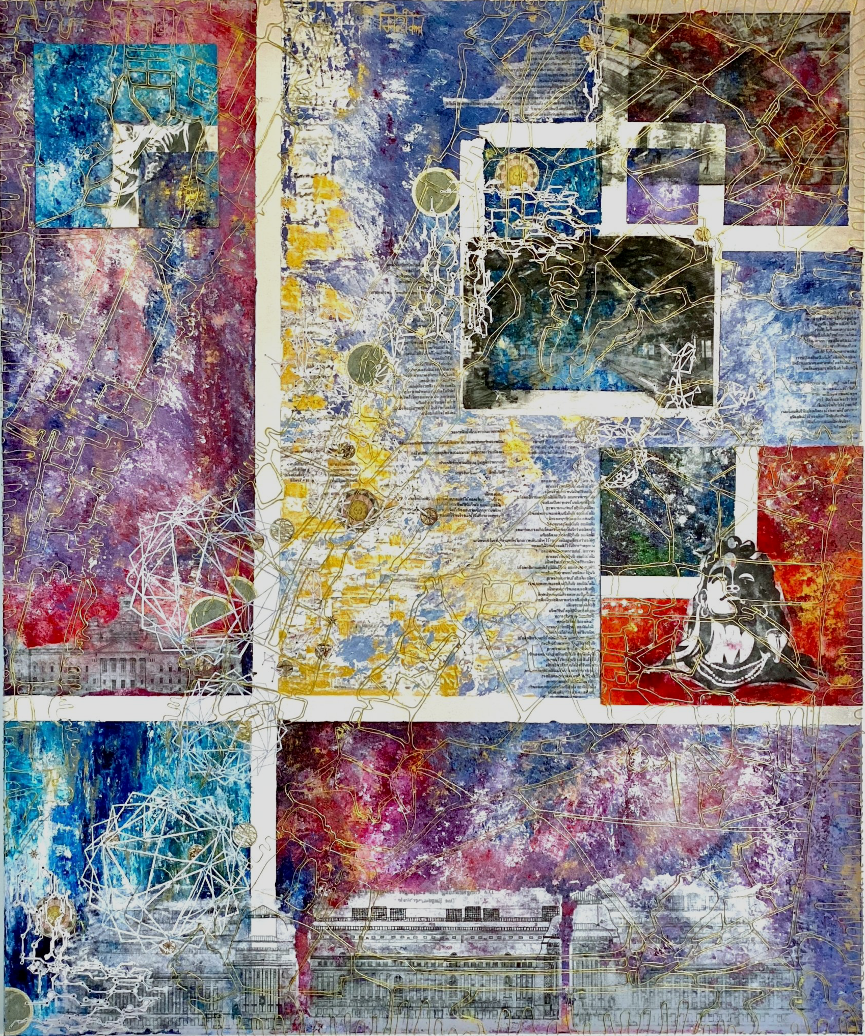 As a third-culture child, the concept of 'home' has always fascinated me. Through my art, I connect the various nations and cultures that have shaped my journey. The initial piece in my series, 'Where is Home?' is a visual narrative of my personal journey. Reflecting on my past in Germany, Sweden, India, and Thailand, I blend acrylics, detailed paper cutouts, and photo transfers. The background is embraced by a wireframe mirroring New York City's grid. The piece symbolises the interconnectedness of diverse experiences in crafting one's sense of home.