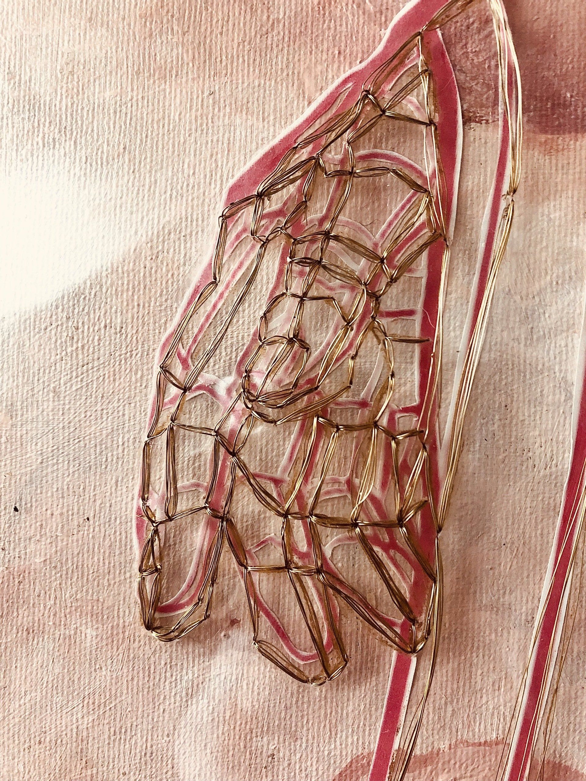 My nights are frequently consumed with nightmares, and one of my methods of coping is to try to find the beauty within them and transfer it to canvas. A dream of the Apocalypse, death, and an abyss of fire was transformed into a tale of resilience and symbolises beauty's triumphant emergence from the depths of chaos. The oil-painted background is adorned with a delicate white and red paper cutout embodying feminine strength. A third layer of thick transparent plastic foil adds depth, while intricate gold wire stitches along the woman's contour. A dozen tiny golden nails secure the plastic foil onto the canvas.