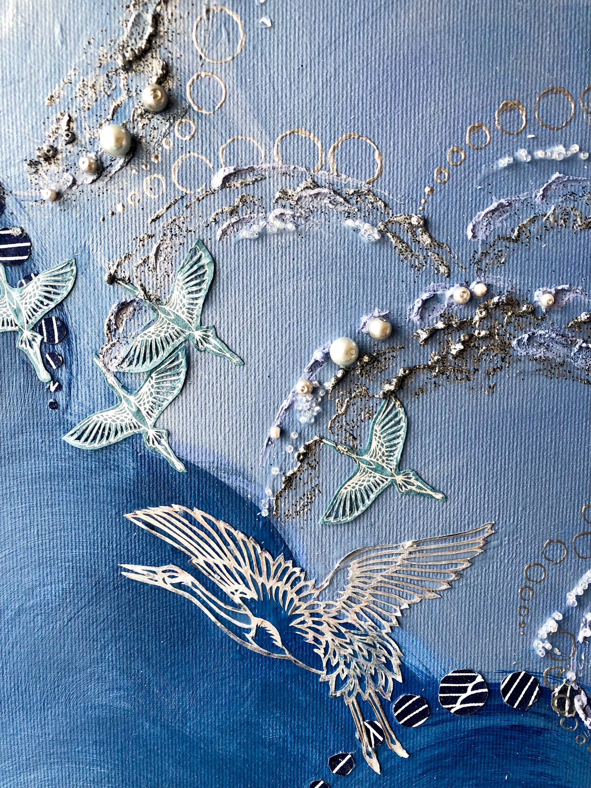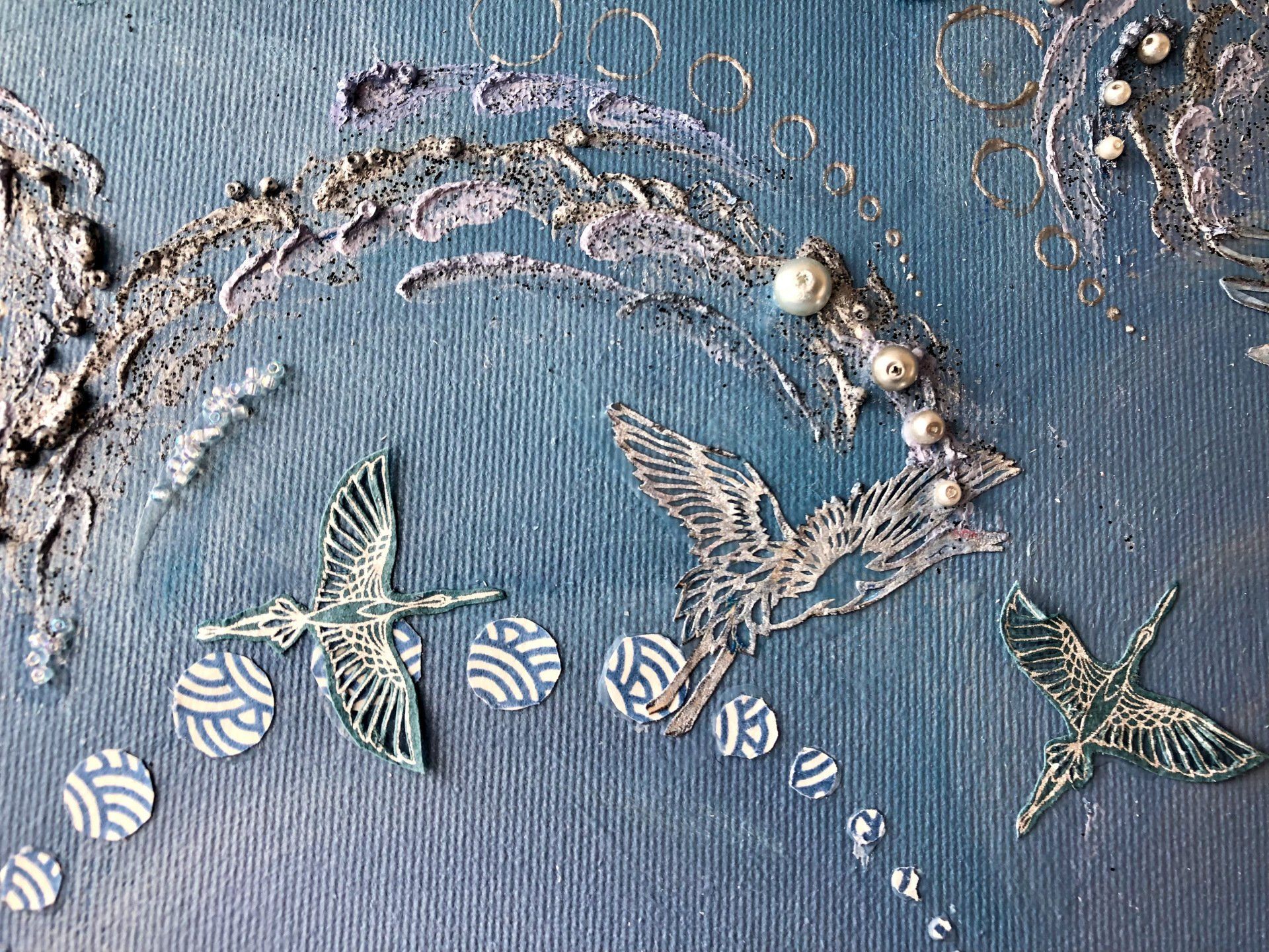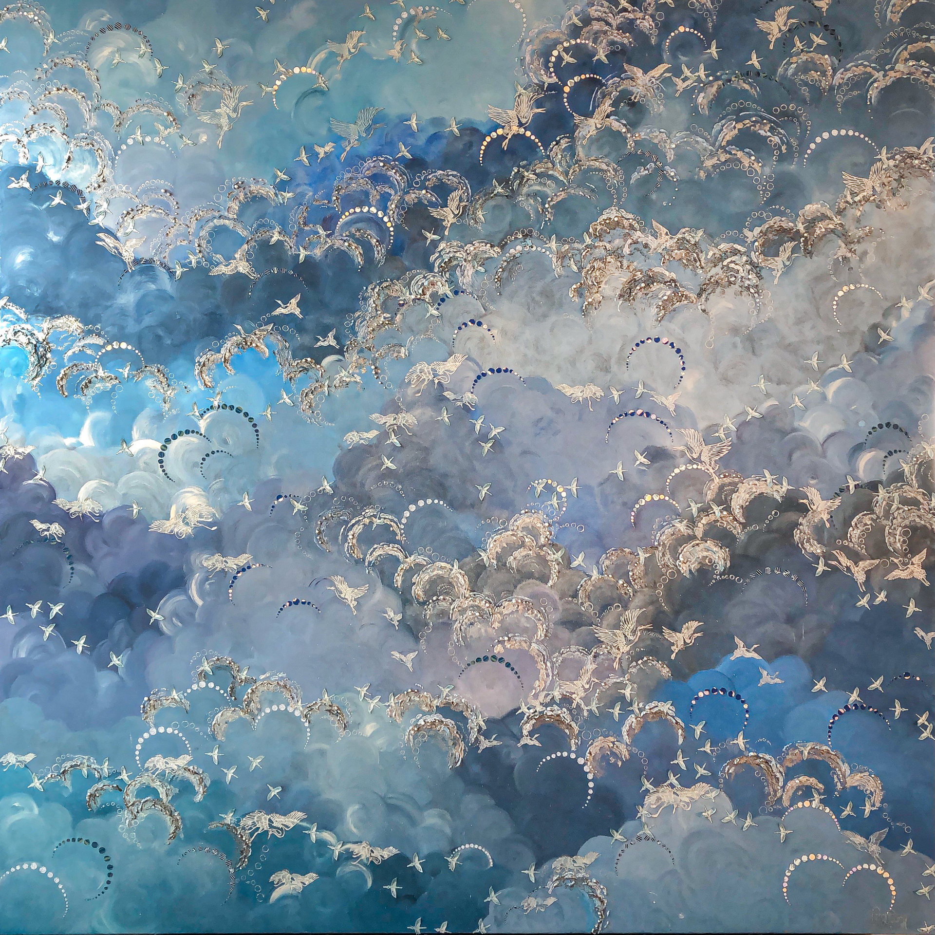Crafted against serene blue acrylic hues resembling clouds, this artwork combines texture and depth. I sought to add dimension by enhancing the cloud formations with clear acrylic gel enriched with black granules and a subtle glitter effect. Incorporating beads and pearls introduced layers of complexity. Drawing inspiration from my Art residency in Japan, I cut Origami paper into variously sized circles, mirroring the fluidity of the cloud patterns. Additionally, many hand-cut cranes traverse the sky, infusing the piece with a sense of movement and grace.