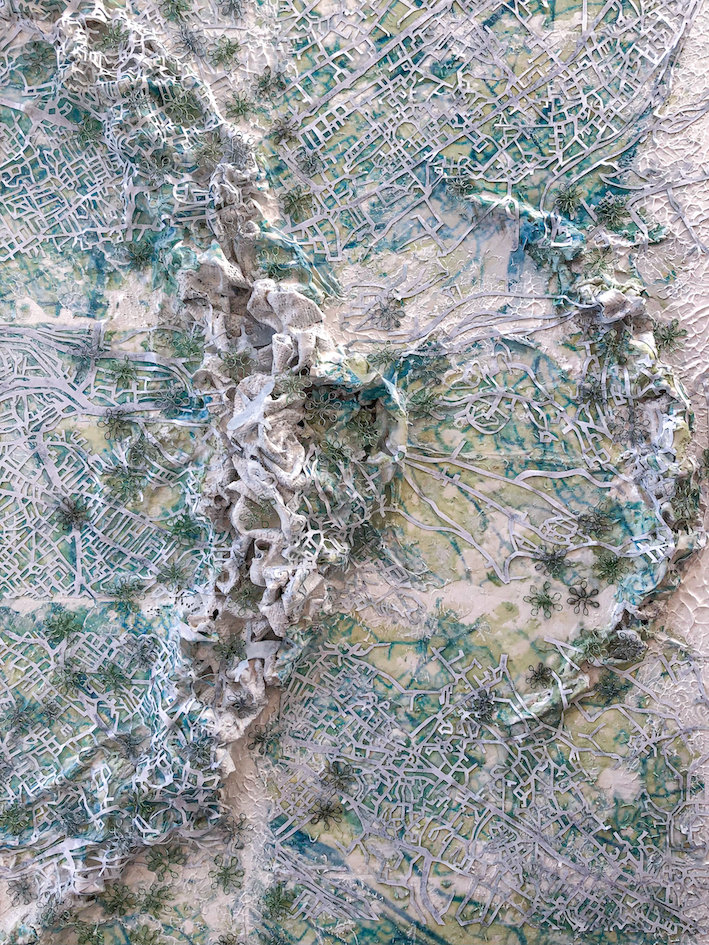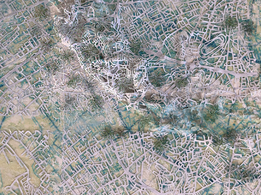 I used Modroc and modelling paste to sculpt the foundation of this artwork, creating a textured and dimensional background. Layered on top are paper transfer of Lyon, France, capturing the city's architectural map. The third dimension is a paper cutout of Lyon's grid, which adds depth and detail. I finished the piece by adding handmade wire flowers, which provide a gentle contrast to the urban environment below.